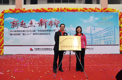 2010年10月11日上午,位于四川省資陽市雁江區(qū)丹山鎮(zhèn)牌坊村的中國免稅希望小學(xué)里喜氣洋洋、熱鬧非凡。特意從北京趕來的中國青少年發(fā)展基金會的汪敏副秘書長、馮敏慧部長,中免集團盧路總裁和四川省市兩地的領(lǐng)導(dǎo)與全校近兩百名師生一起為新落成的“資陽市雁江區(qū)丹山鎮(zhèn)中國免稅希望小學(xué)”舉行了隆重的落成典禮。
