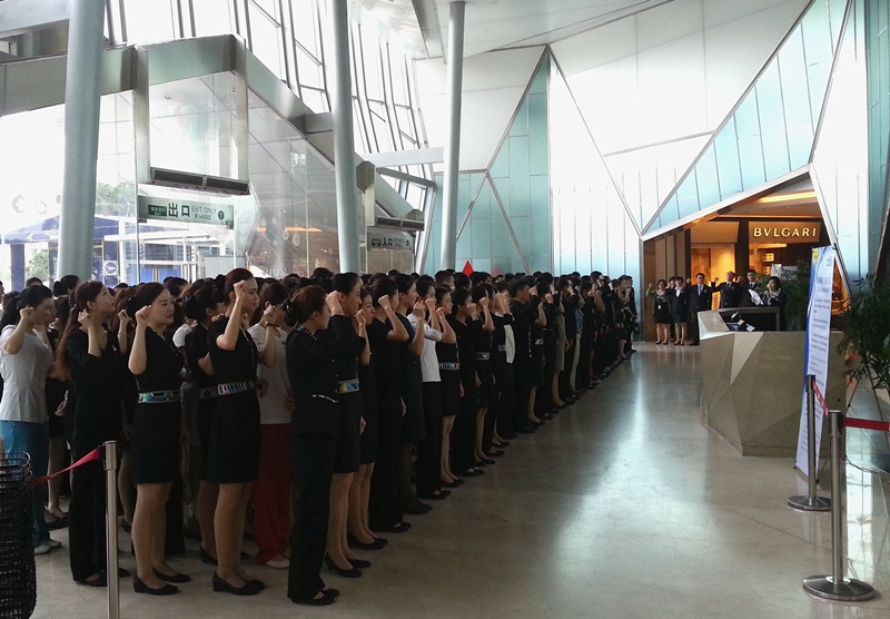 “我宣誓,我們將以客戶為中心,以市場為導向,不怕困難、專業(yè)高效、團隊合作、勇于創(chuàng)新,用誠信經營贏得顧客的信任,用優(yōu)質服務換取顧客的滿意。”洪亮的聲音在三亞市內免稅店內回響,宣誓著承諾和責任。