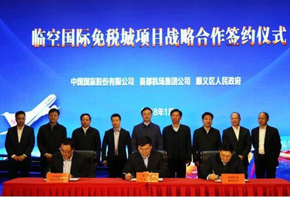 1月12日,中國國旅股份有限公司、首都機(jī)場集團(tuán)、順義區(qū)三方在京舉行臨空國際免稅城項目戰(zhàn)略合作框架協(xié)議簽約儀式。中國旅游集團(tuán)副總經(jīng)理、國旅股份公司董事長李剛,首都機(jī)場集團(tuán)公司總經(jīng)理、黨委副書記劉雪松,北京市順義區(qū)委書記王剛出席簽約儀式,國旅股份公司總經(jīng)理彭輝、首都機(jī)場集團(tuán)黨委書記、副總經(jīng)理宋勝利與順義區(qū)區(qū)委常委、副區(qū)長初軍威代表三方在協(xié)議上簽字。