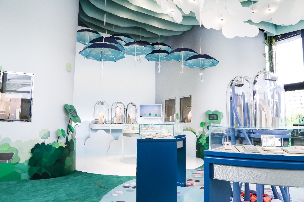 Van Cleef & Arpels梵克雅寶“Alhambra幸運花園”免稅限時精品店位于三亞國際免稅城后廣場。世家要員雅克·雅寶Jacques Arpels常言道:“心懷幸運之愿,方能成為幸運之士。”幸運是梵克雅寶一直以來十分珍視的價值,更是其創(chuàng)意靈感的泉源之一,因此限時精品店內(nèi)部設計以世家標志性四葉幸運圖案為主題,以延續(xù)這珍貴價值。進店后,首先映入訪客眼簾的將是Burcu & Geoffrey 這對法國和土耳其的導演拍檔為Alhambra 特別創(chuàng)作的四葉圖騰造型蝴蝶沿途散播幸運的種子,帶領游客穿梭在幸運花園中,引領大眾一同探索夢幻迷人的Alhambra 幸運花園, 為游客營造出一種舒適愉快的珠寶欣賞空間。