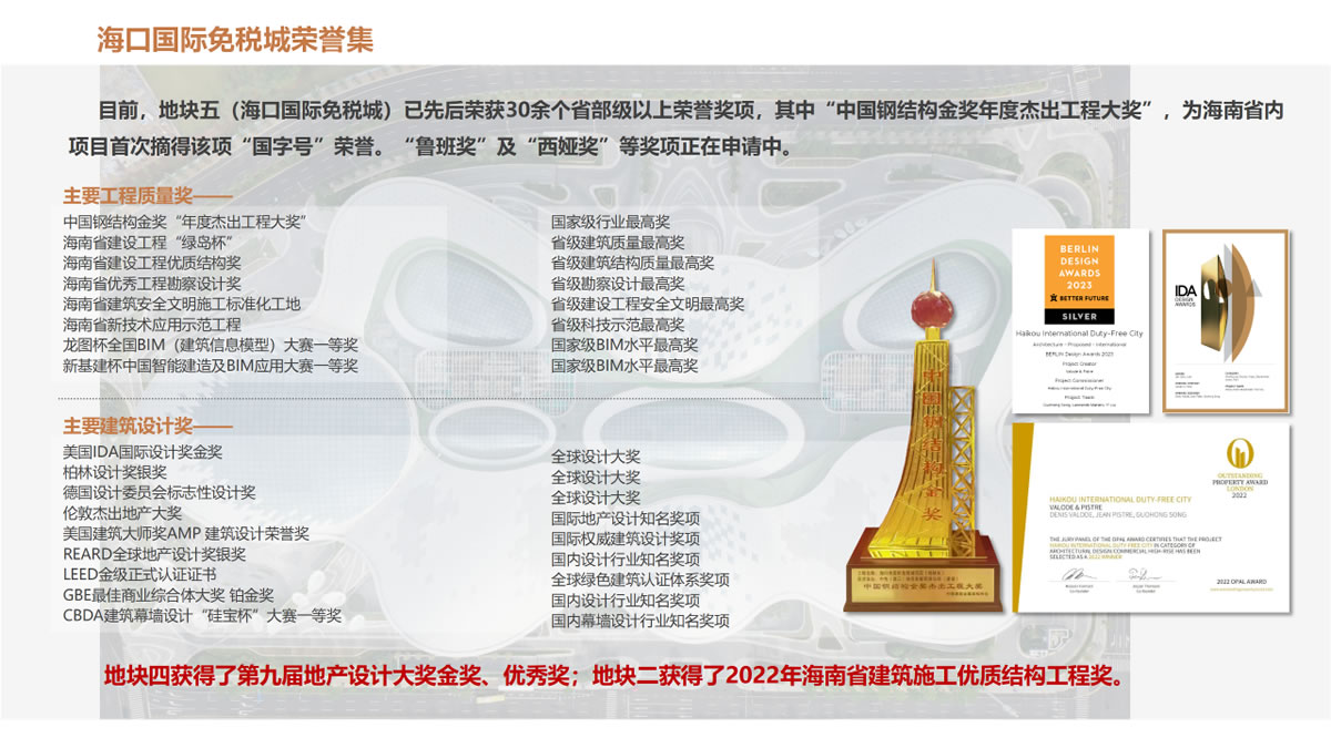 ▲ 海口國際免稅城項目整體建設(shè)所獲榮譽(yù)